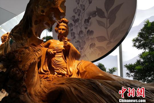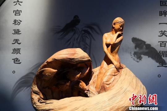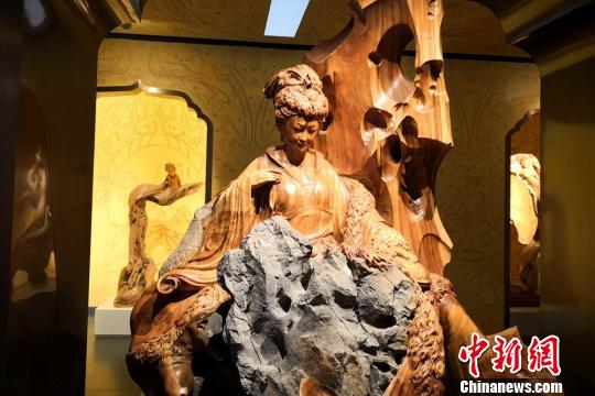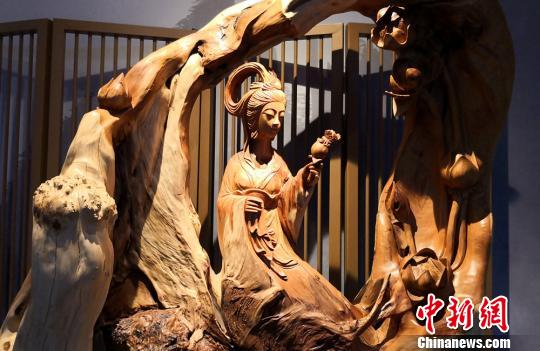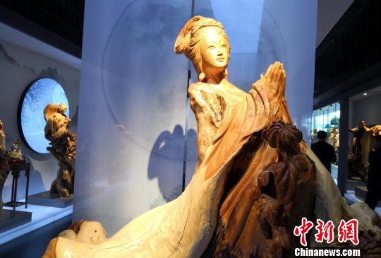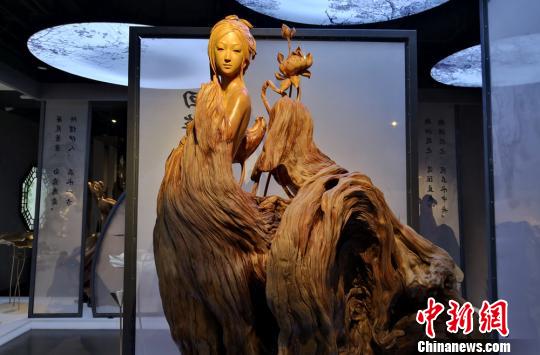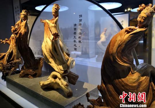 甘肃酒泉收藏达人李新民展出他收藏多年的根雕作品,“四大美女”、“貂蝉拜月”等古代美女形象栩栩如,神态逼真自然,身姿曼妙动人,给人视觉上的享受。