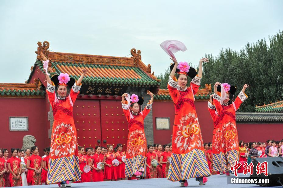 9月19日,“盛京1636——第二届沈阳国际旗袍文化节”在沈阳故宫和大帅府的连接地通天街广场开幕,1636位模特身着旗袍进行走秀表演。图为节目表演。中新社记者 于海洋 摄