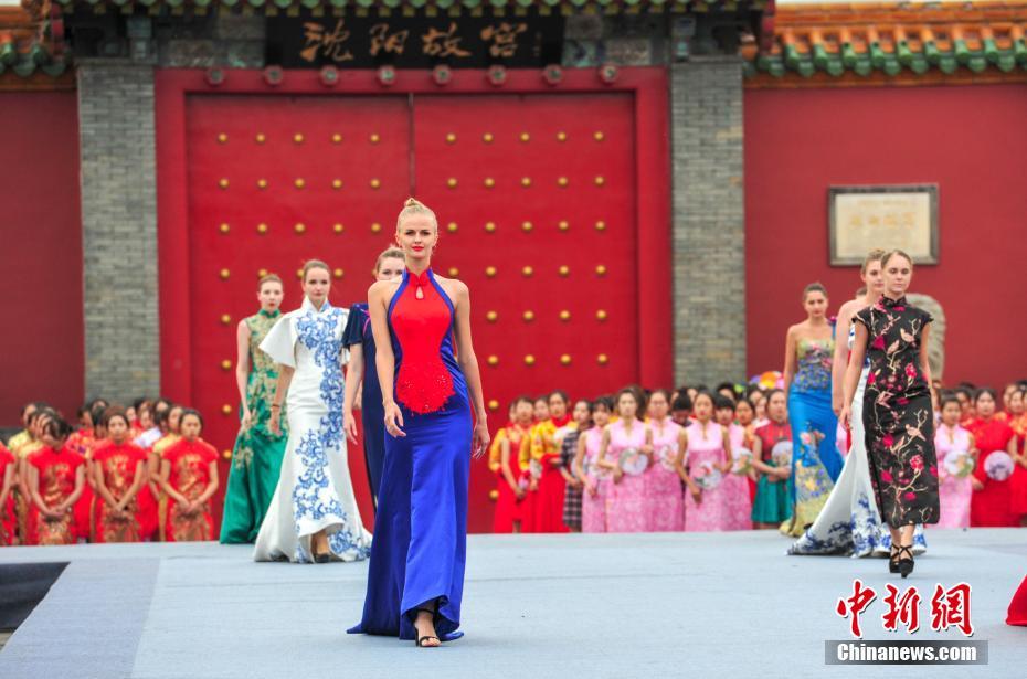 9月19日,在沈阳故宫和大帅府的连接地通天街广场上,1636名身着旗袍的模特展开走秀表演。图为模特在走秀。中新社记者 于海洋 摄