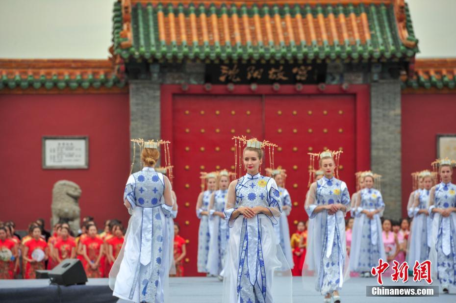 9月19日,在沈阳故宫和大帅府的连接地通天街广场上,1636名身着旗袍的模特展开走秀表演。图为模特在走秀。中新社记者 于海洋 摄