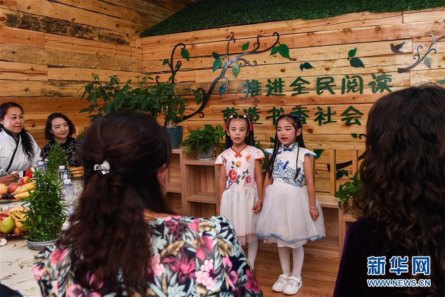 9月21日,两名小朋友在迎中秋诗文朗诵活动中朗诵。 新华社记者 刘磊 摄
