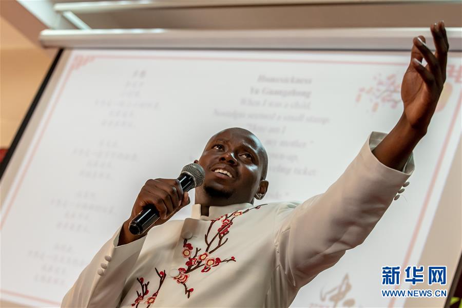 9月21日,在肯尼亚内罗毕,一名肯雅塔大学孔子学院的学生表演诗朗诵。 当日,肯尼亚内罗毕大学孔子学院、肯雅塔大学孔子学院分别举办中秋节庆祝活动,中肯两国师生通过诗朗诵、剪纸、吃月饼等方式欢度中国传统佳节。 新华社记者张宇摄