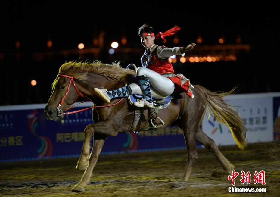9月21日,骑手表演马上绝技。当日,2018年第五届内蒙古国际马术节在呼和浩特启幕,骑手现场演绎精湛马术。马术节期间,论坛、速度赛马、骑乘体验、马术表演等分项将悉数登场。 中新社记者 刘文华 摄