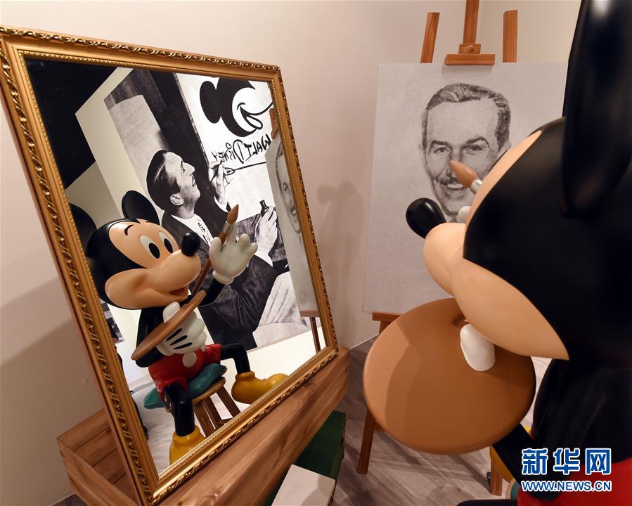 9月22日拍摄的“米奇90周年展览”上正在“绘画”的米奇。当日,“米奇90周年展览”在香港铜锣湾举行。新华社记者 卢炳辉 摄