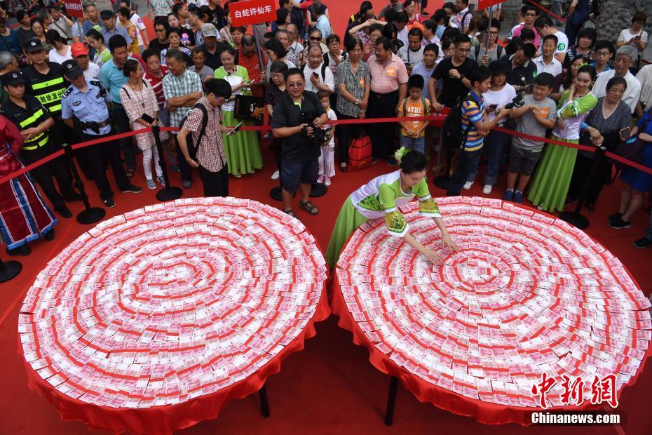 9月23日,杭州宋城景区举行的推广活动上,工作人员用100万元人民币分别拼成了两只“大月饼”,吸引不少游客围观。该景区当日举行了口碑官聘请仪式,100户幸运家庭可免费游览景区,一户幸运家庭可成为景区口碑官,赢取50万酬金。 中新社记者 陈超 摄