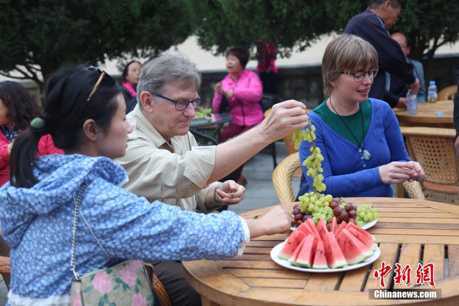 图为中外游客品尝瓜果,观看拜月礼。 钟欣 摄