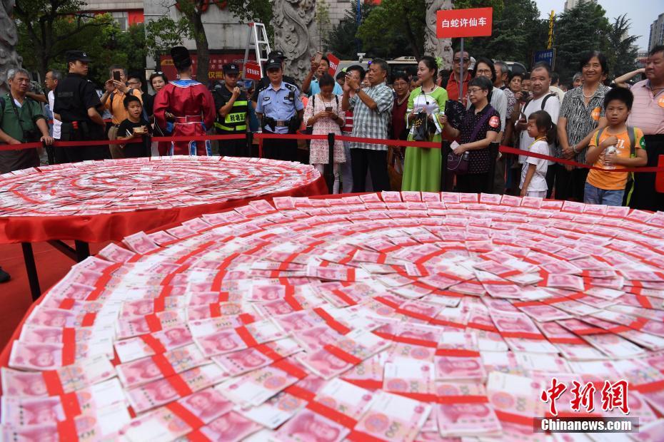 9月23日,杭州宋城景区举行的推广活动上,工作人员用100万元人民币分别拼成了两只“大月饼”,吸引不少游客围观。该景区当日举行了口碑官聘请仪式,100户幸运家庭可免费游览景区,一户幸运家庭可成为景区口碑官,赢取50万酬金。 中新社记者 陈超 摄