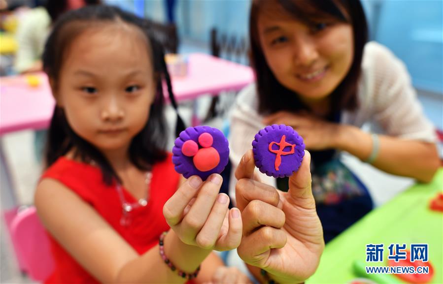 9月24日,在位于海口的海南省博物馆举办的粘土“月饼”制作活动上,家长和小朋友展示他们制作的粘土“月饼”。当日是中国传统佳节中秋节。新华社记者 郭程 摄