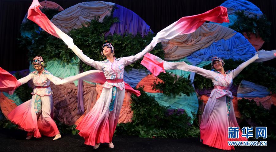 9月23日,在美国科斯塔梅萨南岸广场,演员在中秋游园会上表演。 美国西部最大购物中心南岸广场23日晚举办游园会,庆祝中国传统节日中秋节。 新华社记者李颖摄