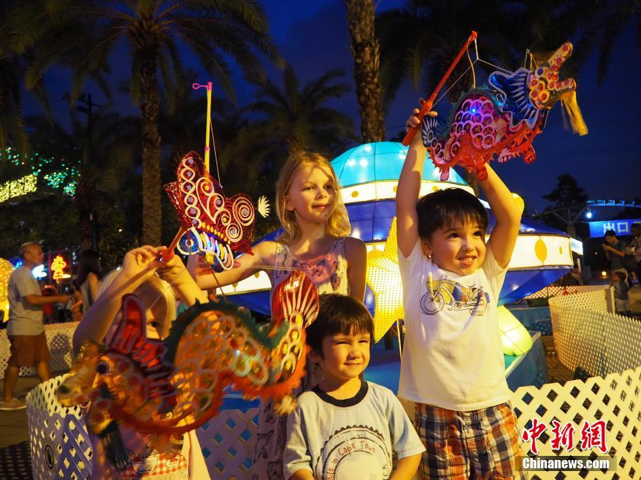 9月24日晚,几名外国小朋友在香港维多利亚公园欢度中秋节,当天,维园场内展出多组光影装置及彩灯。以“星空明月银河夜”为题,展出的光影作品包括《时空之旋涡》、《陨石流星》和《仙后座》的亮丽花灯。 中新社记者 洪少葵 摄