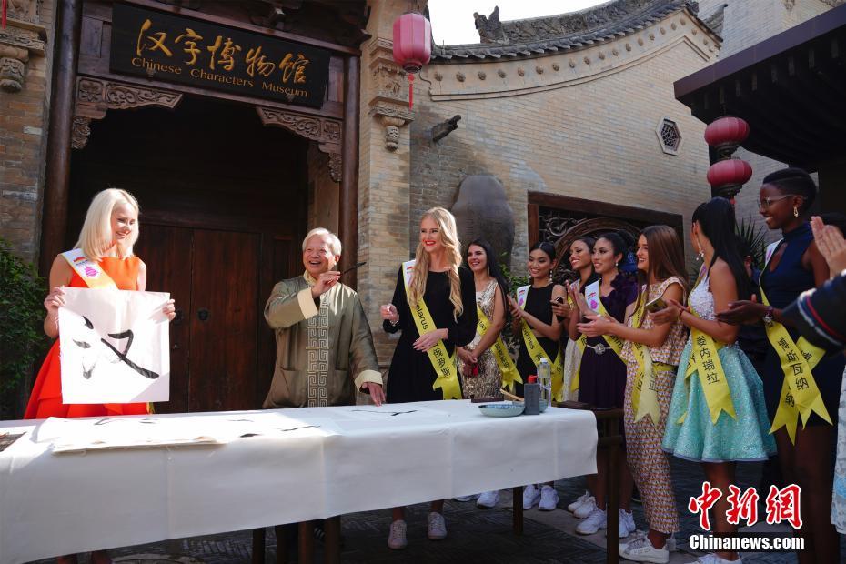 近日,参加2018世界旅游小姐全球总决赛的选手在陕西汉中学习中国书法、地方戏剧表演,品尝汉中传统小吃和特色美食,感受中国传统文化的魅力。2018世界旅游小姐全球总决赛将于9月27日在汉中举行,共有60个国家和地区选手参赛。图为佳丽学习中国书法。 中新社发 钟欣 摄