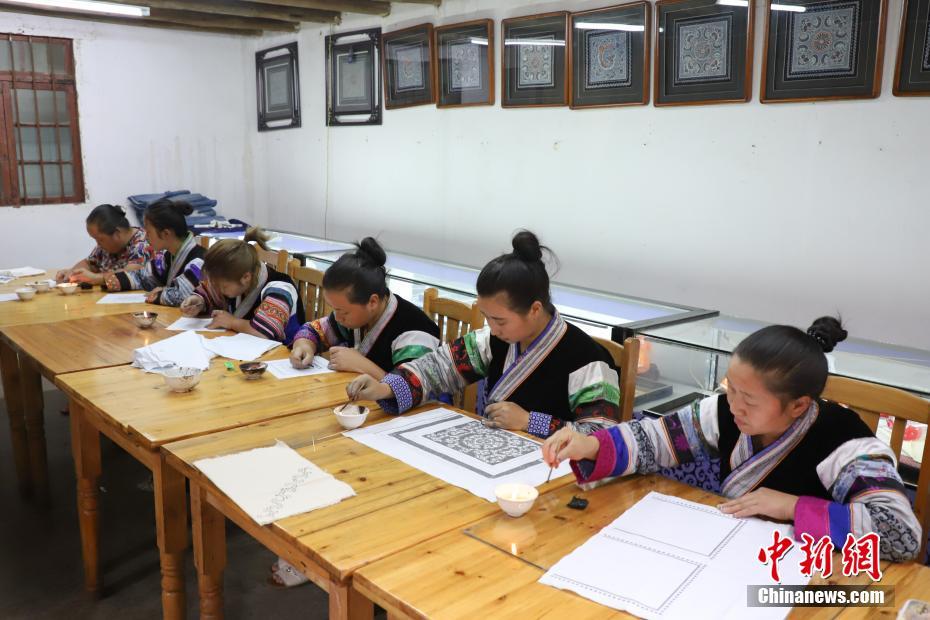 9月25日,织金县官寨乡苗族手工艺人在蜡染。贵州省毕节市织金县苗族蜡染工艺独特,部分蜡染作品已走出大山、走出国门。中新社记者 瞿宏伦 摄