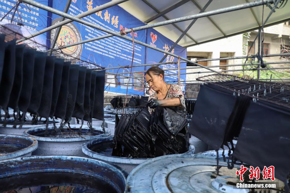 9月25日,织金县官寨乡苗族民众在染制收纳包。贵州省毕节市织金县苗族蜡染工艺独特,部分蜡染作品已走出大山、走出国门。中新社记者 瞿宏伦 摄
