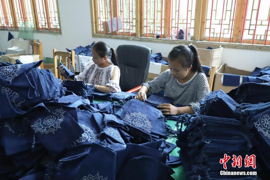 9月25日,蜡染工厂的员工在进行蜡染产品的核验工作。贵州省毕节市织金县苗族蜡染工艺独特,部分蜡染作品已走出大山、走出国门。中新社记者 瞿宏伦 摄