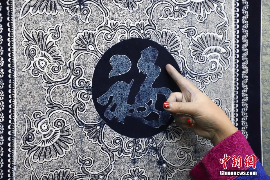 9月25日,苗族手工艺人杨琴琴在介绍《福》字蜡染作品。贵州省毕节市织金县苗族蜡染工艺独特,部分蜡染作品已走出大山、走出国门。中新社记者 瞿宏伦 摄