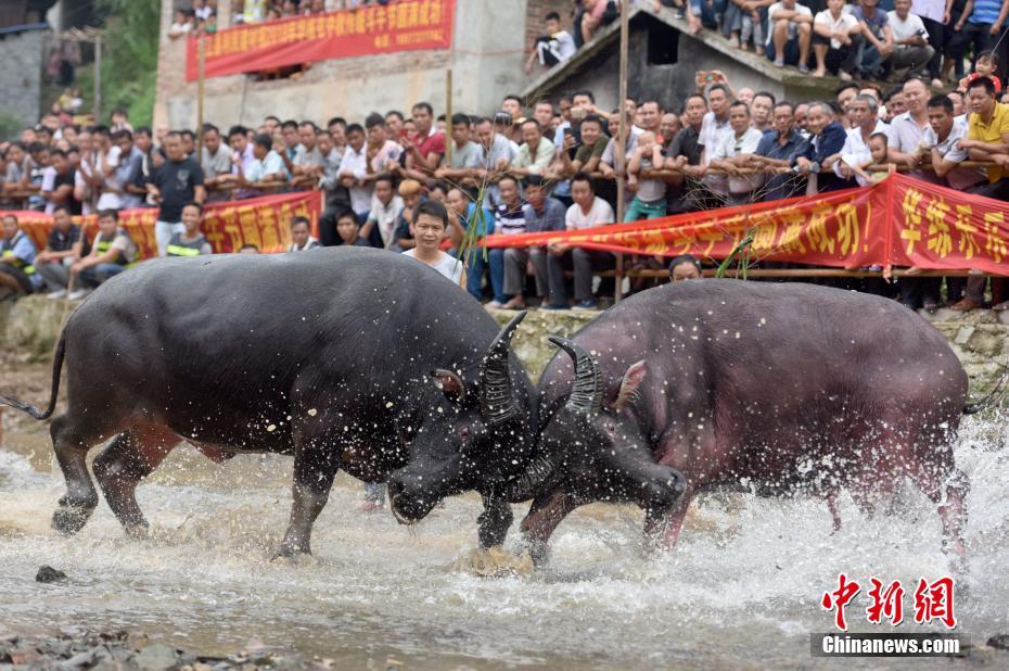 两头牛在河滩上打斗,水花四溅。龚普康 摄
