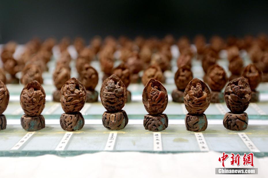 9月25日,西安群众艺术馆内展出的“水浒一百零八将”核桃雕刻。据了解,这些核桃雕刻的作者是今年55岁的蔡青柱,他用时两年在108个鹌鹑蛋大小的核桃上雕刻了一套《水浒》108将,造型各异、图案精美。中新社记者 张远 摄
