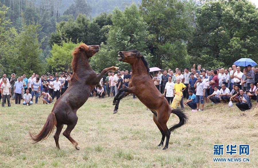 9月25日,在广西融水苗族自治县香粉乡,两匹马正在打斗。 当日,广西融水苗族自治县举行“古龙坡会”,坡会上举行斗马比赛庆祝丰收,吸引众多村民和游客到场观看。 新华社发(龙涛 摄)