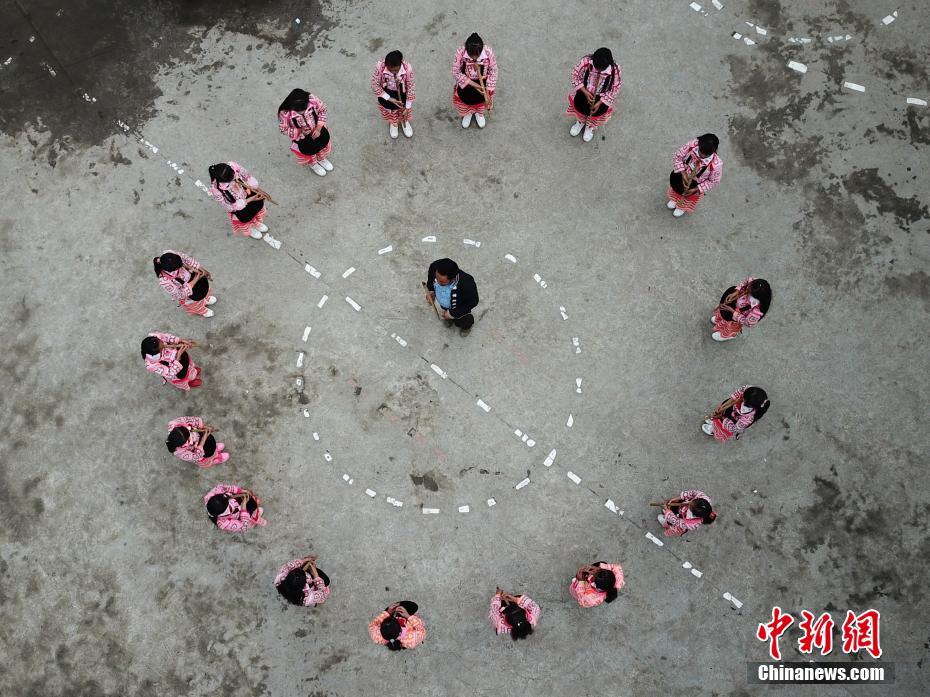 9月26日,航拍兴趣班学生围成圈在操场吹奏三眼箫。当日,贵州省毕节市织金县阿弓镇化董村化董小学迎来了每周的“三眼箫”非遗兴趣班。从2016年开始,化董小学就将三眼箫融入课堂,由非遗传承人杨明传授五年级以上学生演奏和制作三眼箫,以此来传承非遗文化。中新社记者 瞿宏伦 摄