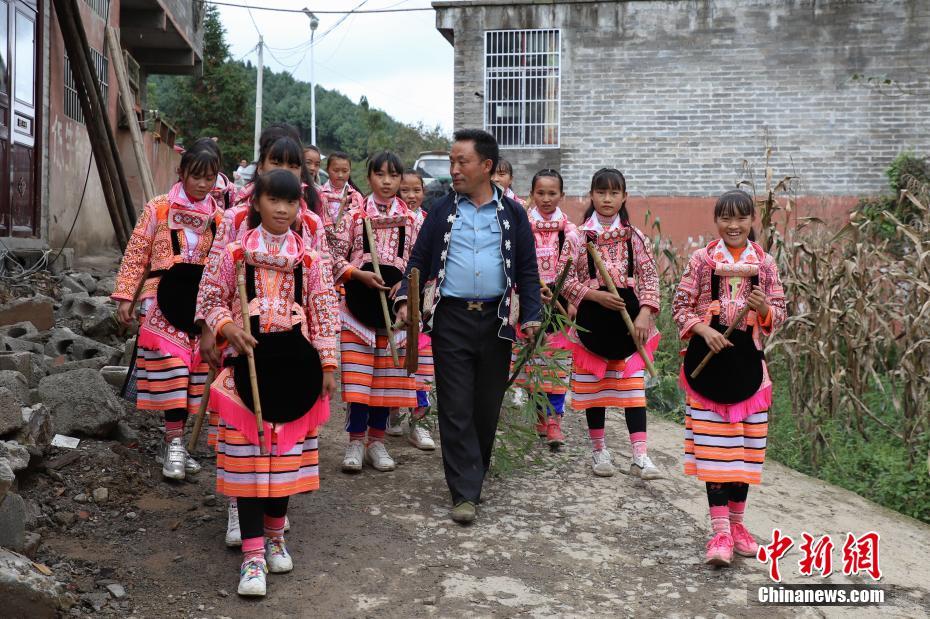 9月26日,制作实践课完毕后杨明(中)和学生走回学校。当日,贵州省毕节市织金县阿弓镇化董村化董小学迎来了每周的“三眼箫”非遗兴趣班。从2016年开始,化董小学就将三眼箫融入课堂,由非遗传承人杨明传授五年级以上学生演奏和制作三眼箫,以此来传承非遗文化。中新社记者 瞿宏伦 摄
