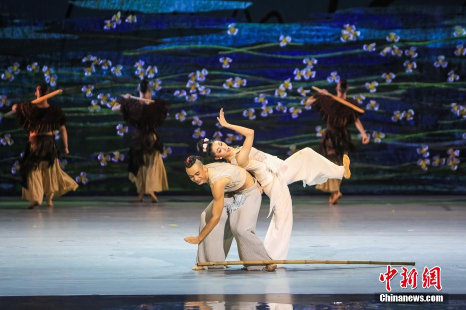 9月26日晚,舞剧《刘三姐》在广西南宁预演时表现刘三姐与阿牛哥爱情缠绵的一幕。9月28日,该剧将在南宁市广西文化艺术中心首演,向中国改革开放40周年及广西壮族自治区成立60周年献礼。中新社记者 陈冠言 摄