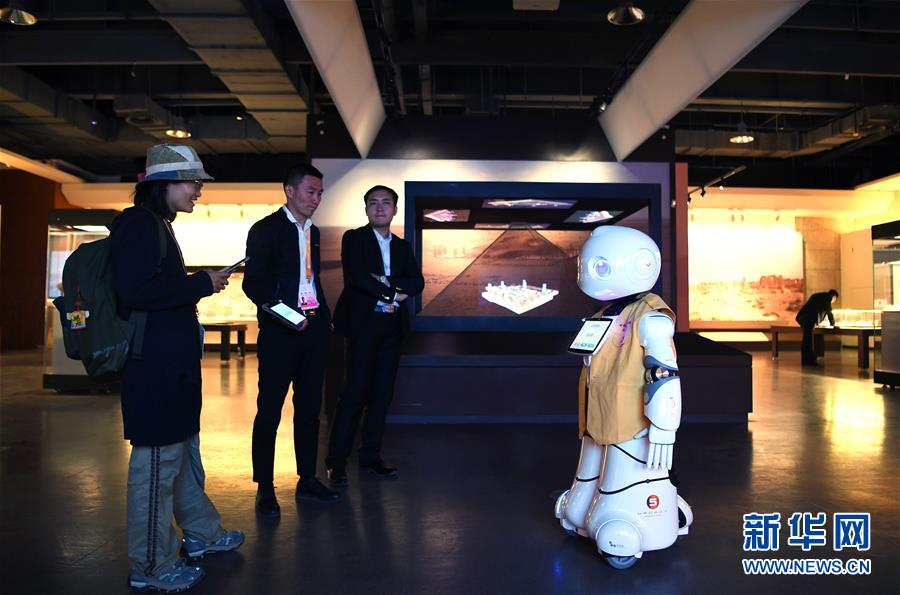 9月27日,在敦煌国际会展中心,机器人为参观者讲解“古道天马——丝绸之路上的交通”展览。 新华社记者范培珅摄