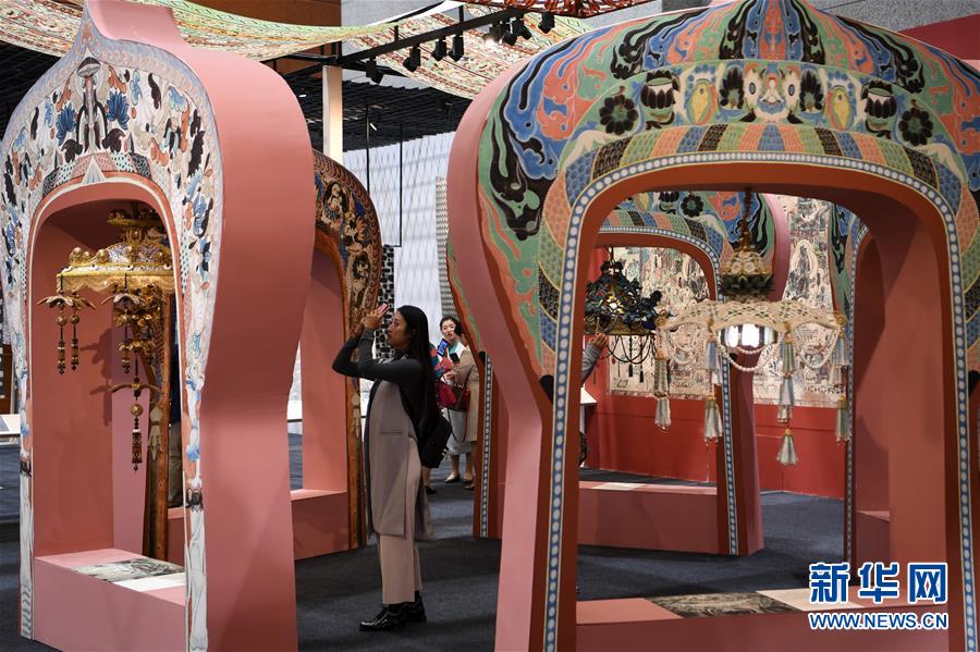 9月27日,在敦煌国际会展中心,参观者欣赏展出的艺术品。 新华社记者范培珅摄