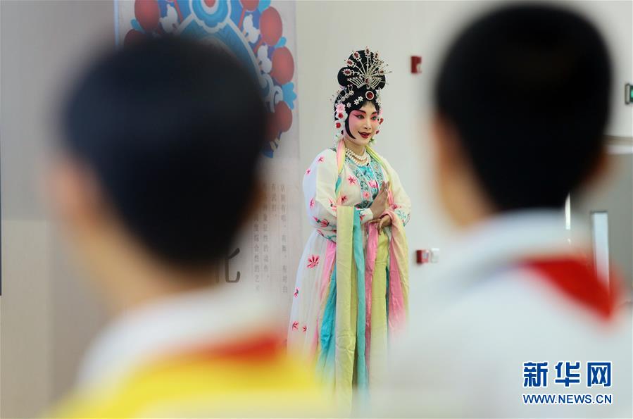 9月26日,天津青年京剧团的演员在为师生表演《天女散花》。 新华社发(刘东岳 摄)