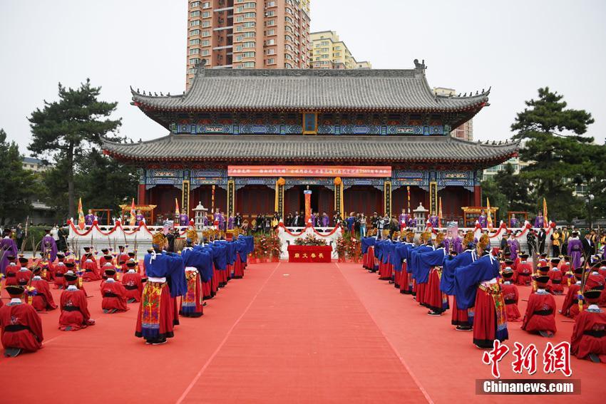 长春文庙举行了纪念孔子诞辰2569周年仿古祭祀活动,以表达对孔子的敬意。张瑶 摄