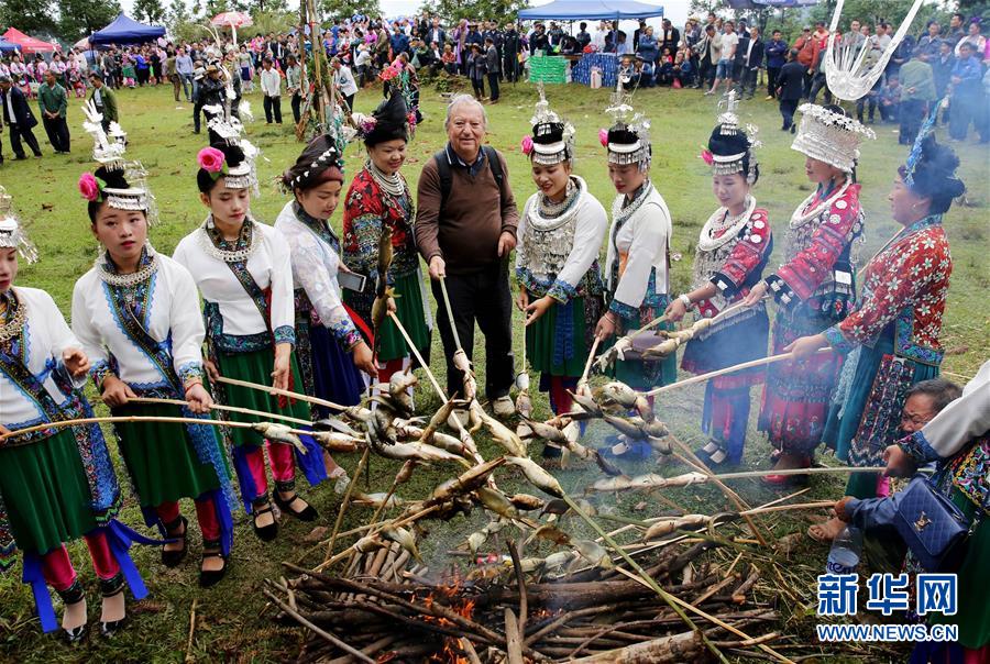 9月27日,在广西柳州市融水苗族自治县红水乡高文村,苗族群众与游客一起烤鱼。 新华社发(龙涛 摄)