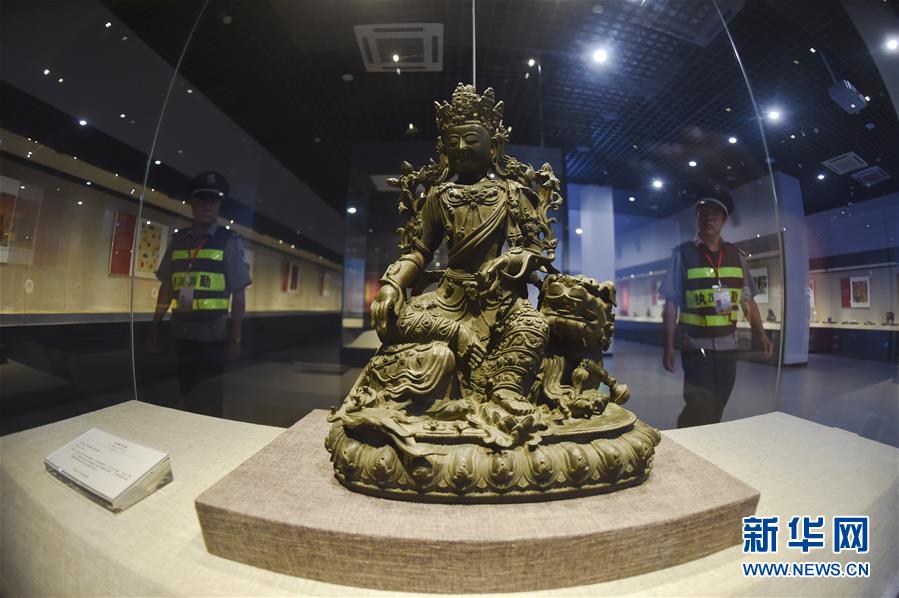 9月28日,福建省石狮市博物馆的安保人员在展品附近巡视。 由北京故宫博物院、石狮市人民政府主办的“丝路狮缘——故宫狮文化珍宝展”将于10月1日起在福建省石狮市博物馆免费向社会公众开放。展览将持续至12月15日。 新华社记者 宋为伟 摄