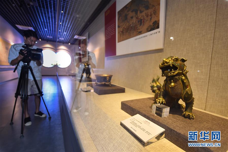 9月28日,一名记者在福建省石狮市博物馆拍摄展品。 由北京故宫博物院、石狮市人民政府主办的“丝路狮缘——故宫狮文化珍宝展”将于10月1日起在福建省石狮市博物馆免费向社会公众开放。展览将持续至12月15日。 新华社记者 宋为伟 摄