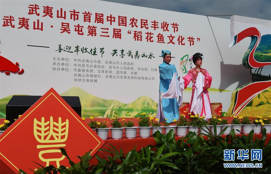 9月28日,票友在武夷山市吴屯乡举办的丰收节上表演越剧。 当日,福建省武夷山市首届中国农民丰收节暨武夷山·吴屯第三届“稻花鱼文化节”举行,当地农民欢聚一堂,载歌载舞庆祝丰收。 新华社记者 张国俊摄