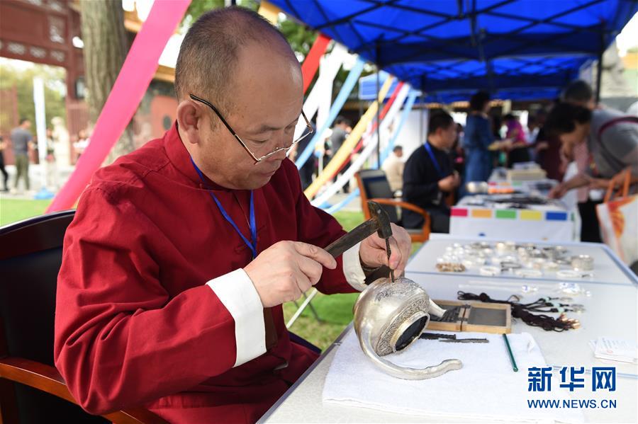 9月28日,湟中银铜器制作及鎏金技艺传承人何满在活动现场展示银器制作。新华社记者李博摄