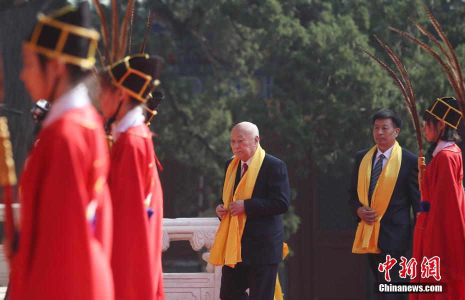 9月28日,世界孔子后裔联谊总会会长孔德墉(中)参加祭孔大典。当日,北京孔庙和国子监博物馆大成殿前举行“释奠礼”,纪念孔子诞辰2569周年。中新社记者 卞正锋 摄
