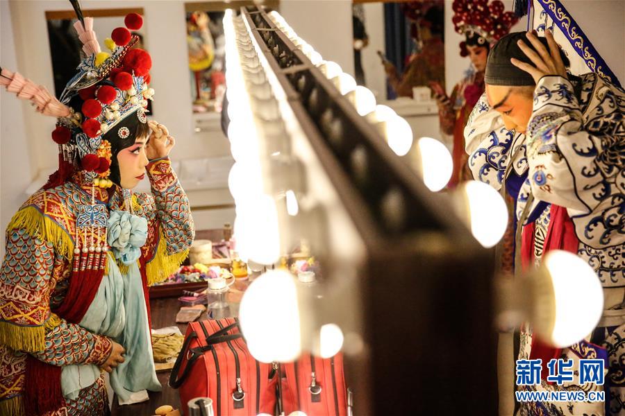 9月28日,在河北石家庄大剧院,梆子演员在后台化装准备登场。