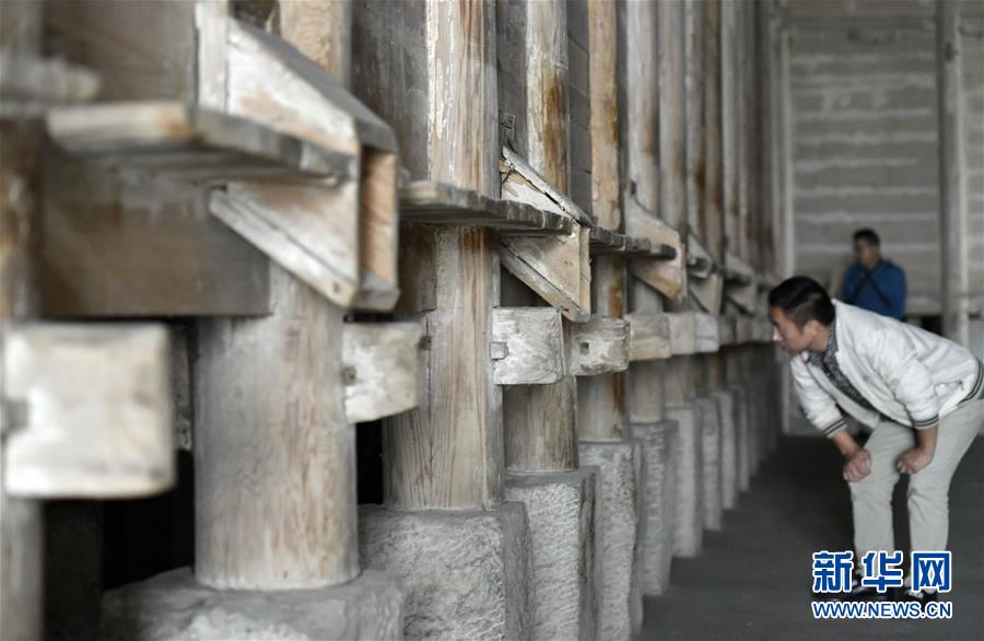 这座粮仓建成于1951年秋,仓容880吨。顶部用数百根木头、采用卯榫方式交错支撑形成“轿顶”,并用布瓦覆盖,空气通透;底部用数百根方形石柱支撑将粮仓抬高,使粮仓悬于空中,达到防潮防鼠的目的。 目前,该粮仓作为文物保护单位,经原貌修缮后已部分对公众开放。 新华社发(宋文 摄)