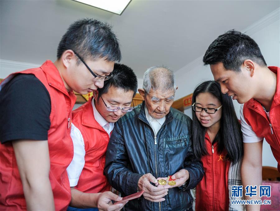 9月29日,老兵周凤山(中)向志愿者展示他的荣誉勋章。新华社记者徐昱摄