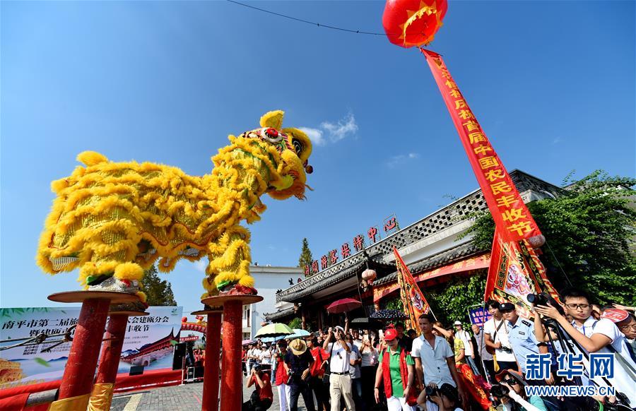 9月29日,在建瓯市小松镇湖头村,人们在丰收节上观看民俗表演——舞狮。 新华社记者 张国俊 摄