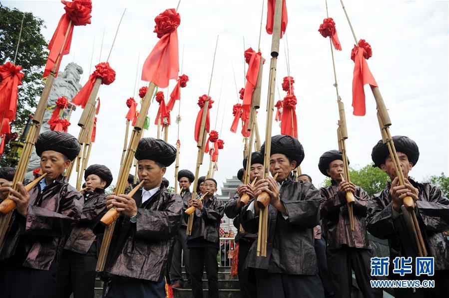9月29日,人们在剑河仰阿莎文化周开幕式上演奏芦笙。 新华社发(杨文斌 摄)