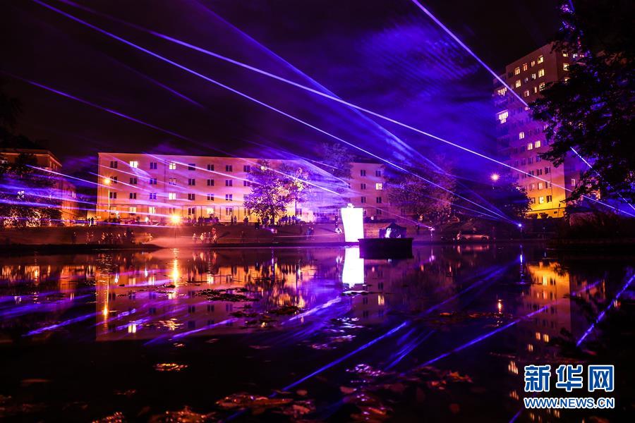这是9月28日在波兰罗兹市中心拍摄的2018“舞动”灯光节现场。2018“舞动”灯光节于9月28日至30日在波兰中部交通枢纽城市——罗兹市举行,各式各样的光影表演在这座城市的各个角落同时上演,组成了一场如梦如幻的大型灯光秀。新华社记者 陈序 摄