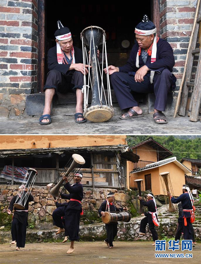这是一张拼版照片。上图:在广西金秀瑶族自治县六巷乡六巷村下古陈屯,国家级非物质文化遗产项目瑶族长鼓舞(黄泥鼓舞)代表性传承人盘振松(左)和盘志明在探讨黄泥鼓制作(8月1日摄)。下图:在广西金秀瑶族自治县六巷乡六巷村下古陈屯,村民在跳黄泥鼓舞(8月1日摄)。