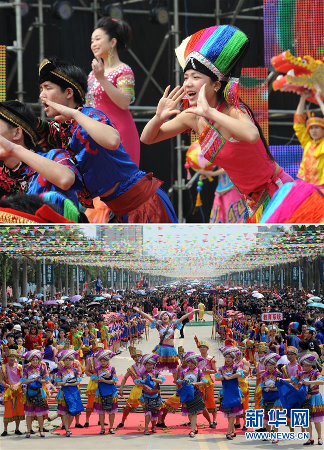这张拼版照片的上图和下图显示的是,在广西南宁市武鸣区,人们载歌载舞欢庆“壮族三月三”的场景(2012年3月24日摄)。“壮族三月三”被列入国家级非物质文化遗产名录。