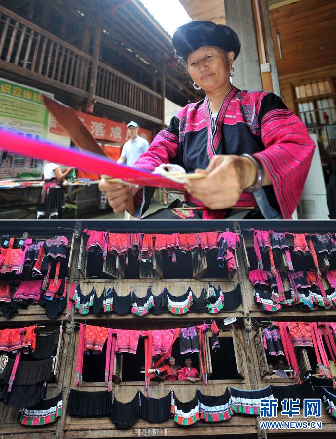这是一张拼版照片。上图:在广西龙胜各族自治县龙脊镇黄洛瑶寨,国家级非物质文化遗产项目瑶族服饰代表性传承人潘继凤在制作瑶族服饰(2014年7月3日摄)。下图:在广西龙胜各族自治县龙脊镇金坑瑶寨,两名女子站在晒满红瑶服饰的木楼上(2014年7月2日摄)。