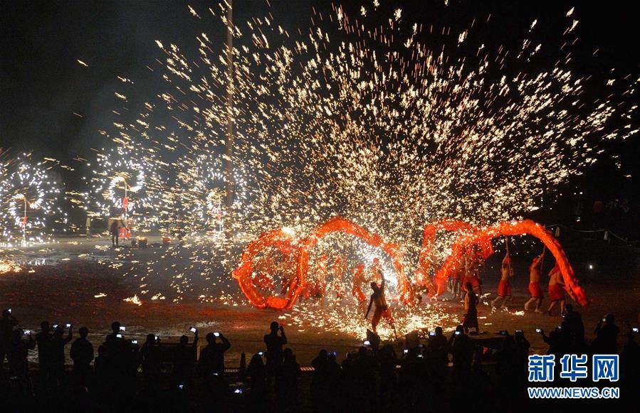 10月3日晚,民间艺人在贵州省普定县龙场乡秀水村表演“铁水冲龙”。