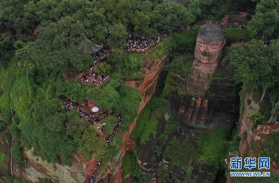 10月4日,游客在乐山大佛景区的栈道上有序排队,一睹大佛真容(无人机拍摄)。