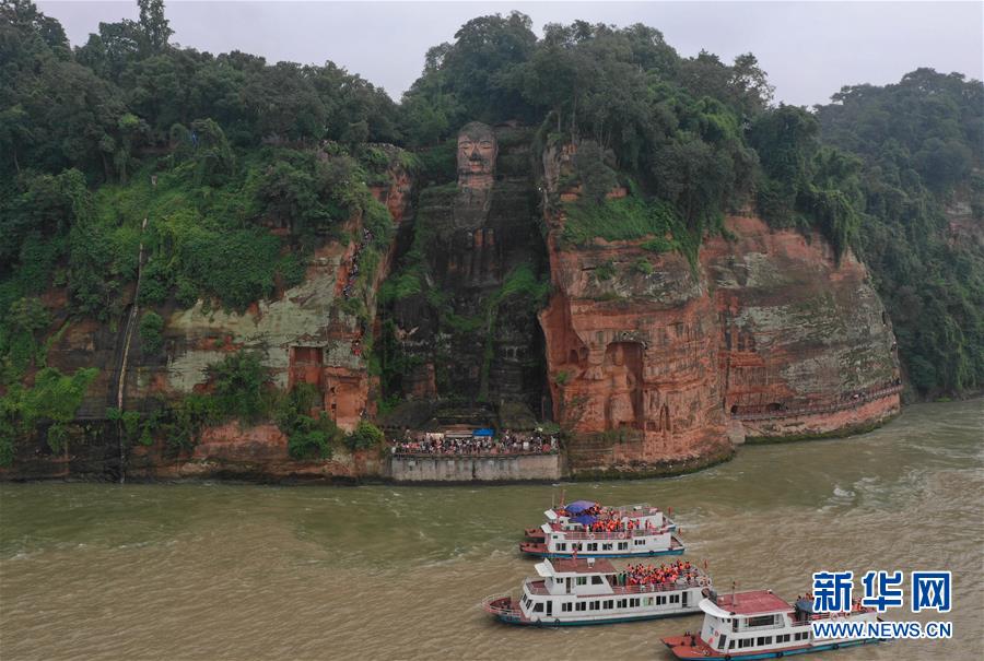 10月4日,游客乘坐游船一睹乐山大佛真容(无人机拍摄)。 新华社记者 江宏景 摄