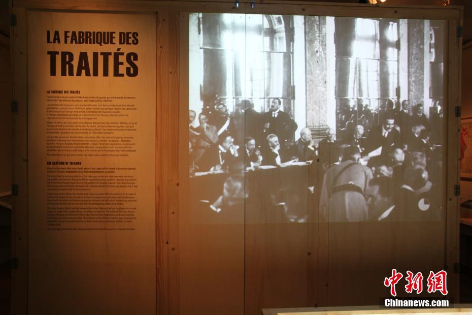 当地时间10月5日,第一次世界大战结束百年主题纪念展在法国军事博物馆开展。图为在展览中播放巴黎和会的影像。中新社记者 李洋 摄