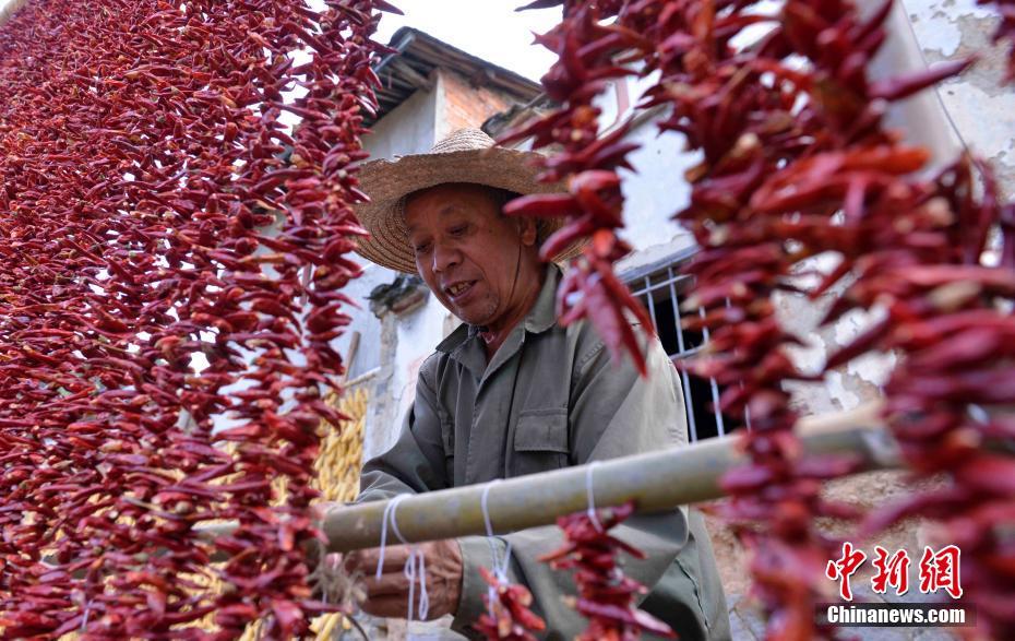 村民们将秋季收获来的红红的辣椒、黄黄的玉米等色彩缤纷的农作物,晾晒在古民居房前屋后的木制晒架上。王旺旺 摄