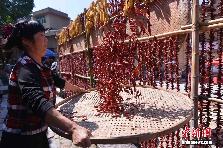 村民将自己收获来的辣椒、玉米等农作物拿出来晾晒。王旺旺 摄